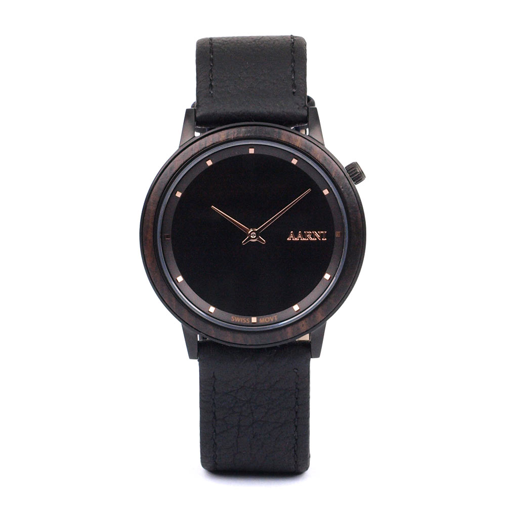Aarni Loihi Eeben, kellossa on upea tummasta eebenpuusta valmistettu kehys sekä musta hirvennahka ranneke.