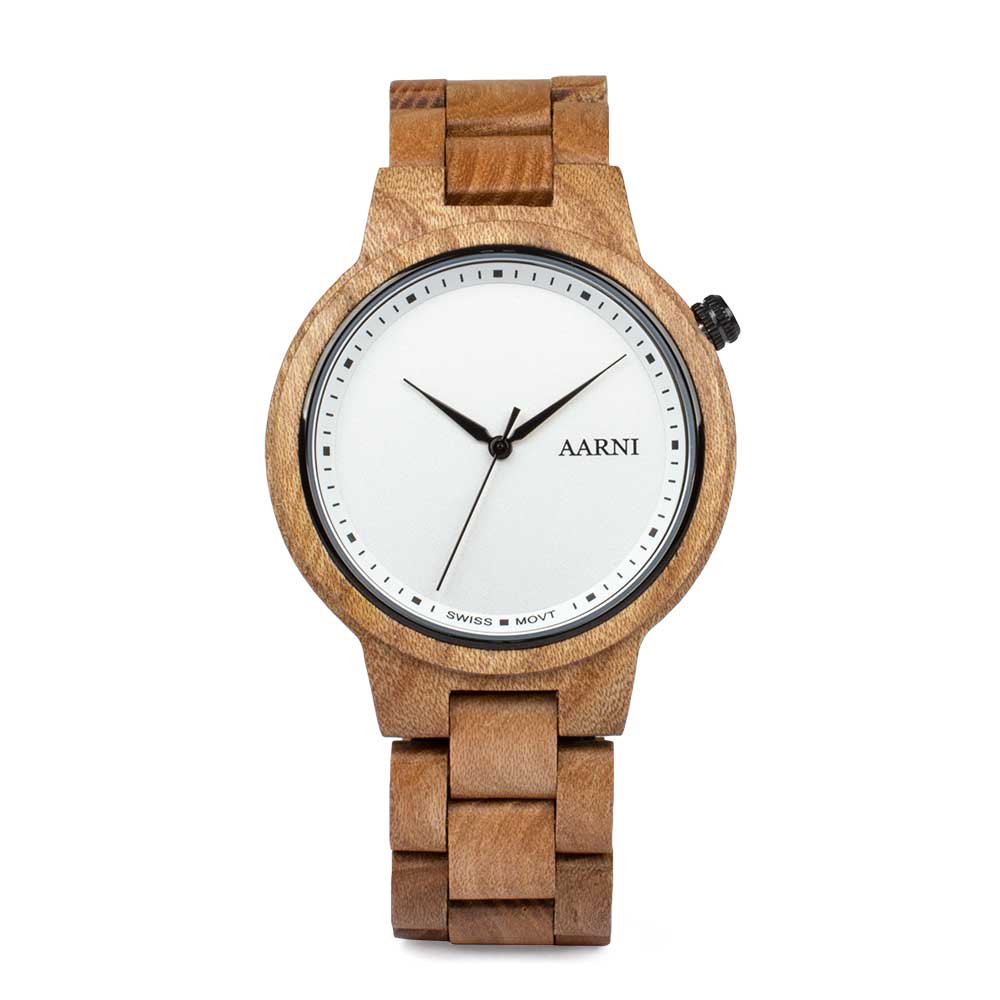 Kaikki Aarni kellot on suunniteltu roiskevesitiiviiksi, mutta puun luonnollisista ominaisuuksista johtuen tulee välttää veteen upottamista. Huomioithan, että puun kuviointi ja sävy ovat yksilöllisiä, mikä tekee jokaisesta rannekellosta uniikin.