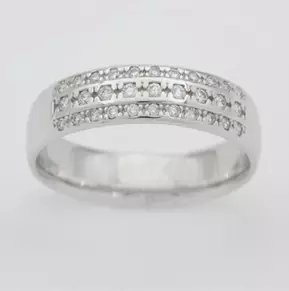 Tukeva runkoinen, valkokultainen timanttisormus jossa timantteja kolmessa rivissä. Sormuksen runko sisältä pyöristetty joka tekee levestä sormusrungosta miellyttävät käyttää.