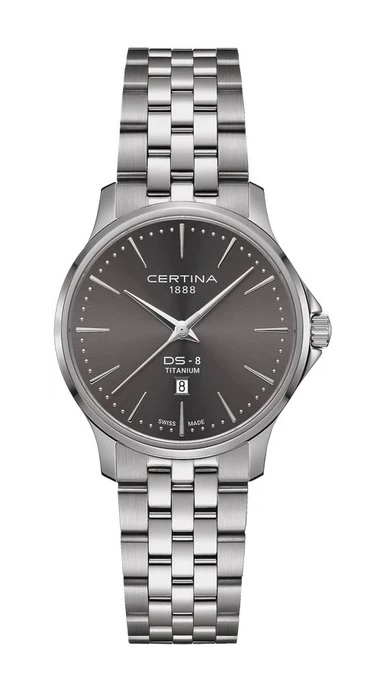 Certina DS-8 Lady - erittäin kevyt titaanikuorinen naisten rannekello kauniin harmaanruskealla taululla.