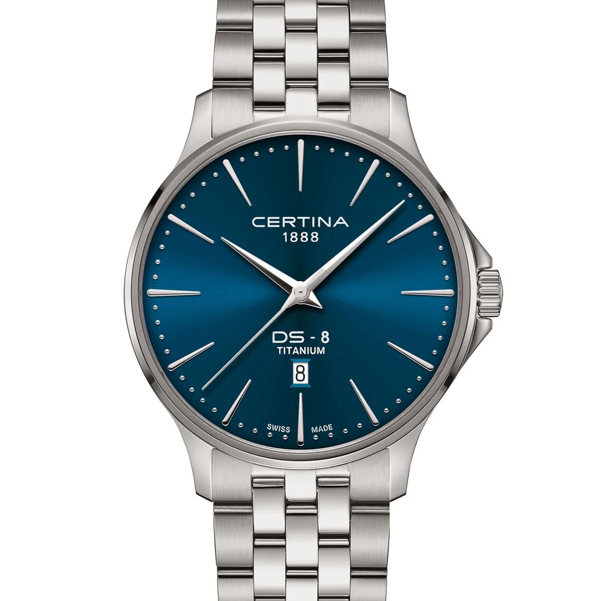 Certina DS-8 titanium C045.410.44.041.00 Certina miesten rannekello upealla sinisellä kellotaululla. Kevyet ja allergiasoimattomat titaanikuoret ja ranneke takaavat miellyttävän käyttökokemuksen.... Lue lisää