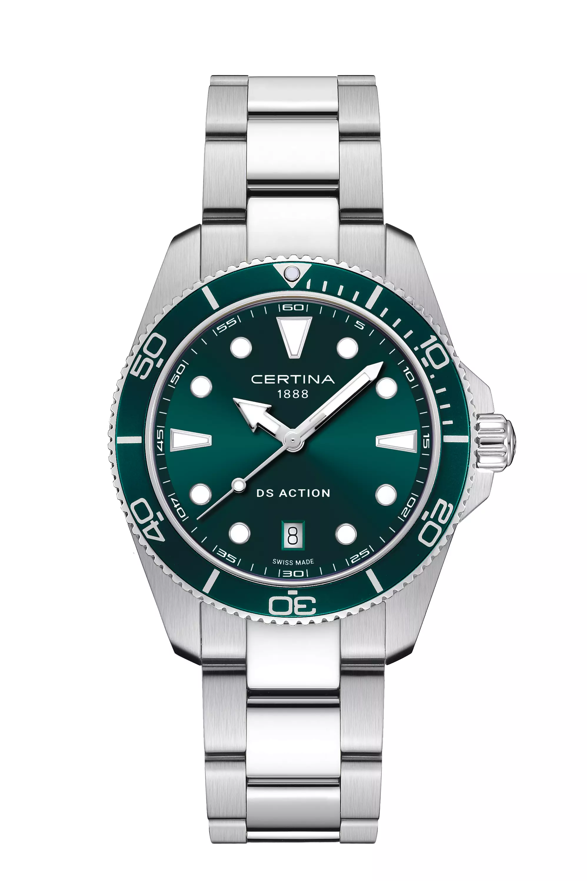 Certina DS Action - suosittu malli pienemmässä koossa nyt myös paristokoneella! Tyylikäs, hohtavan vihreä kellotaulu ja bezel.