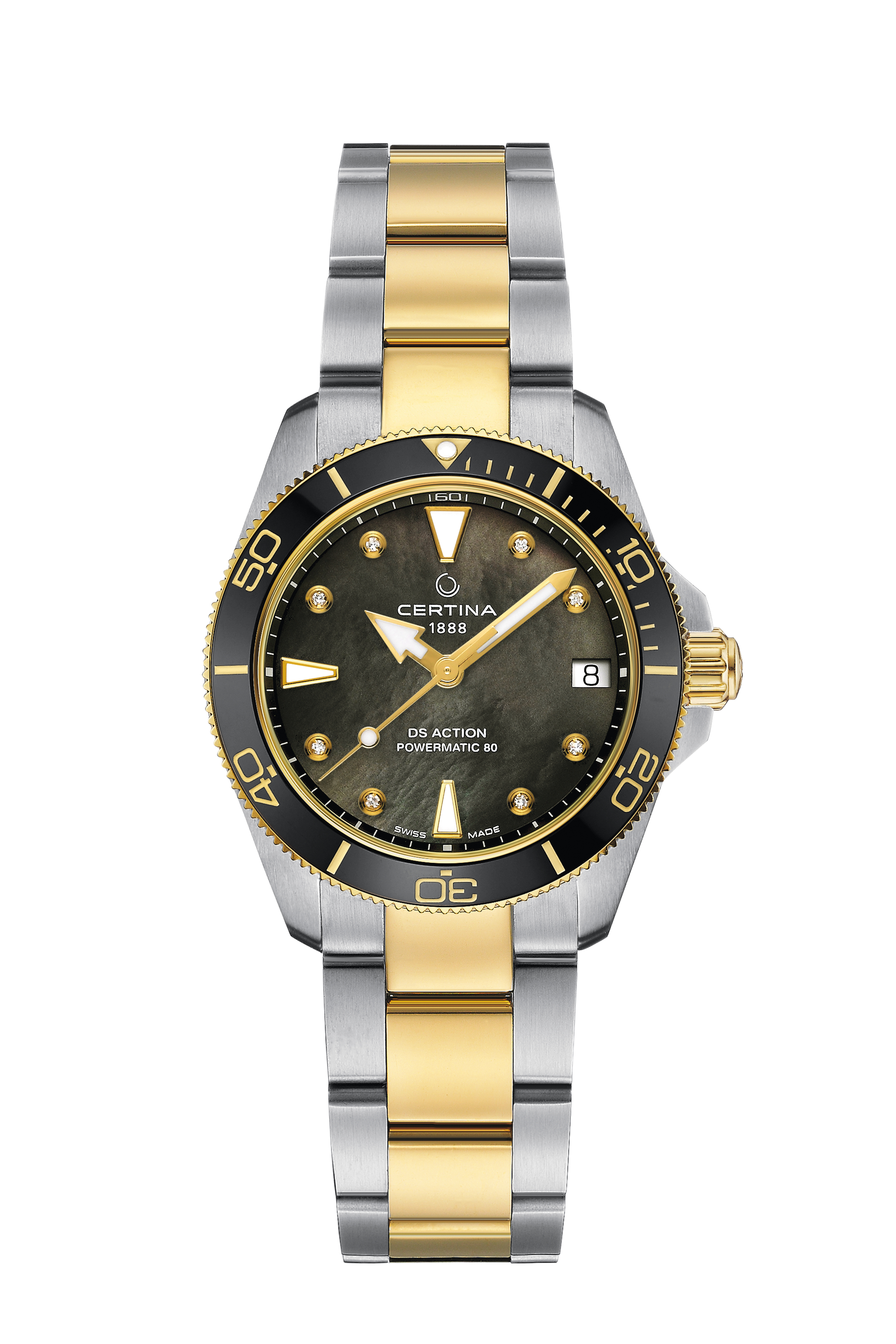 Upea naisten Certina DS Action sinivihreällä helmiäistaululla jossa timantit tuntimerkkien kohdalla. Laadukas sveitsiläinen automaattikoneisto 80tunnin käyntivarallla.