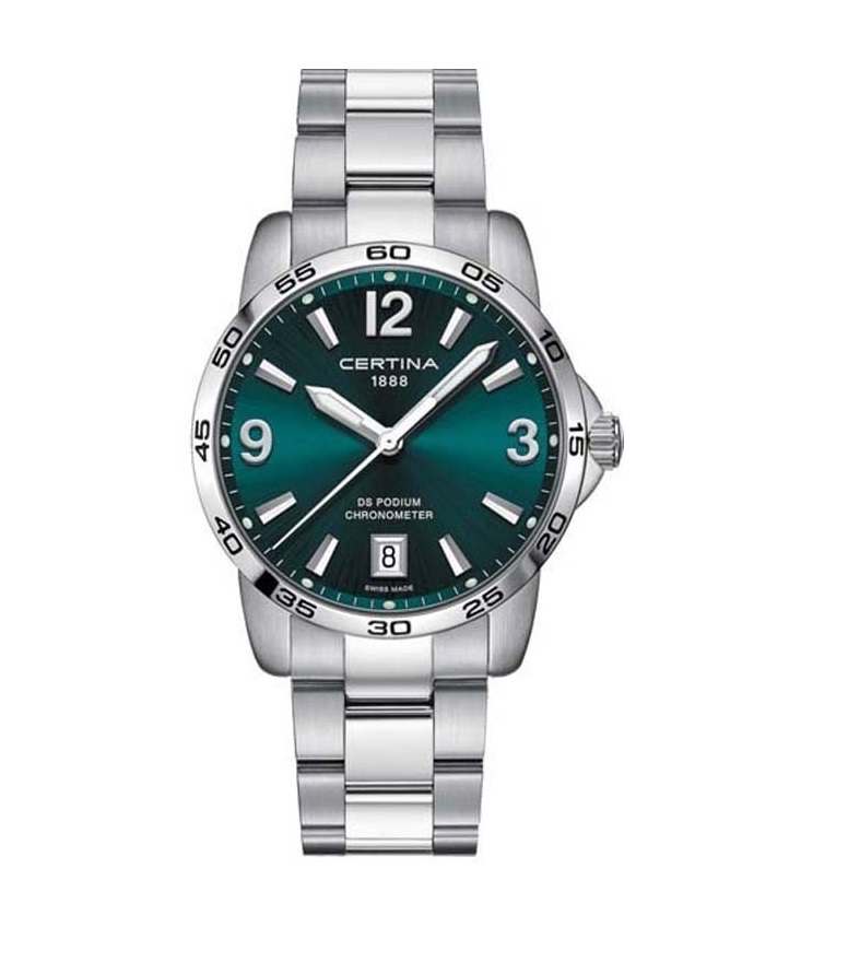 Certina DS Podium miesten rannekello. Naarmuntumattomalla safiirilasilla ja upealla vihreällä kellotaululla, 100m vesitiiviys.
