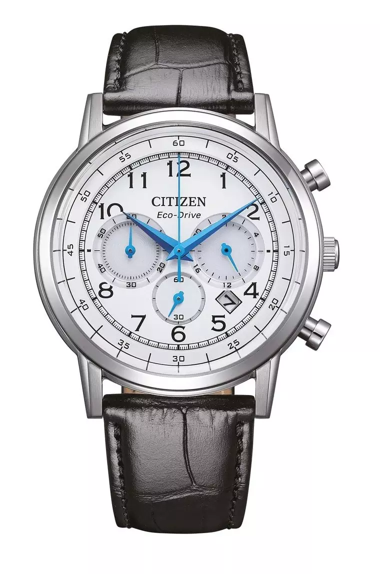 Citizenin eco-drive kello kronotoiminnoilla. Valkeaan kellotauluun tuo ilmettä siniset viisarit!