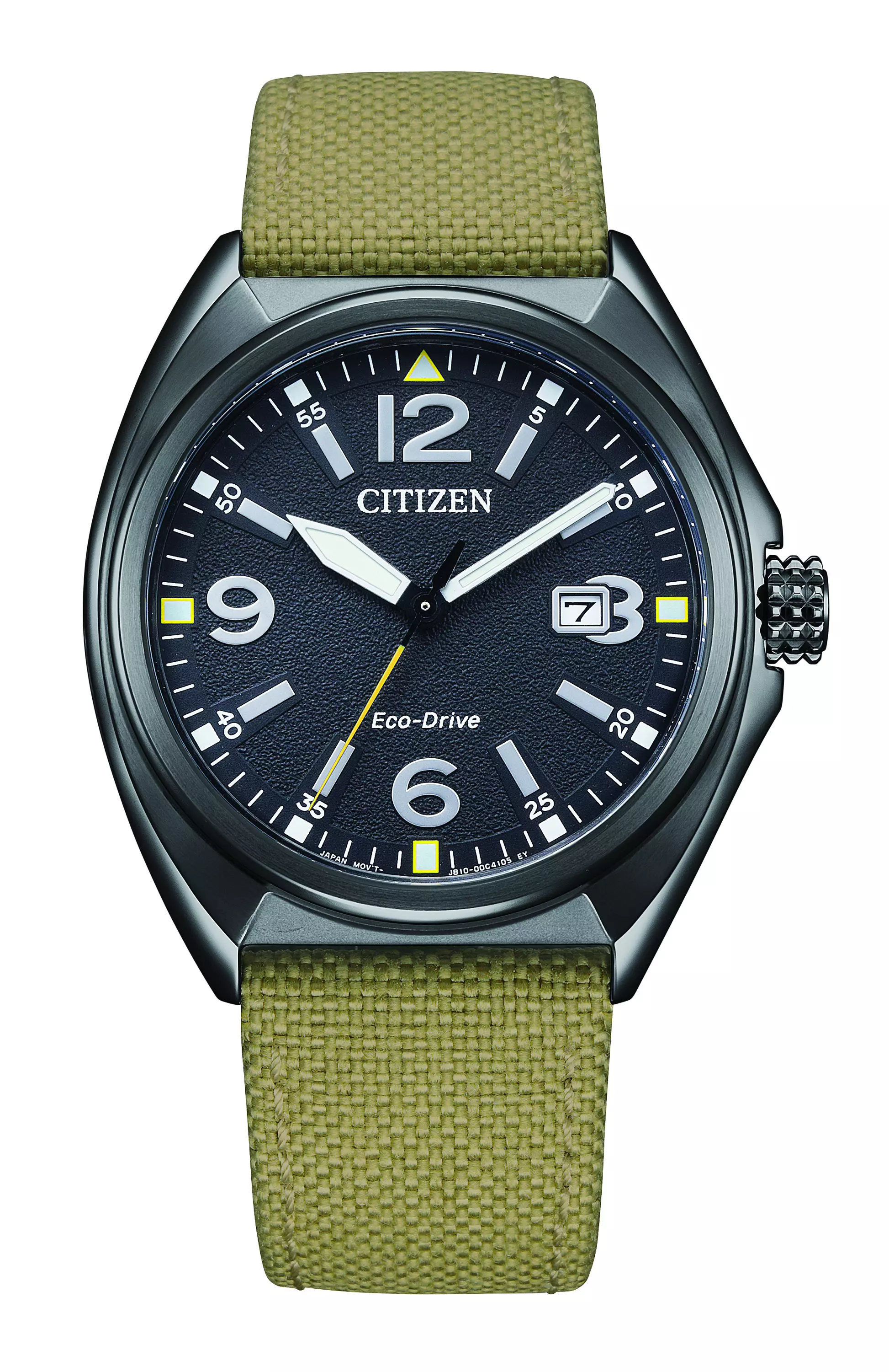 Miesten Eco-Drive kello mustalla kellotaululla ja beigella nylon rannekkeella.