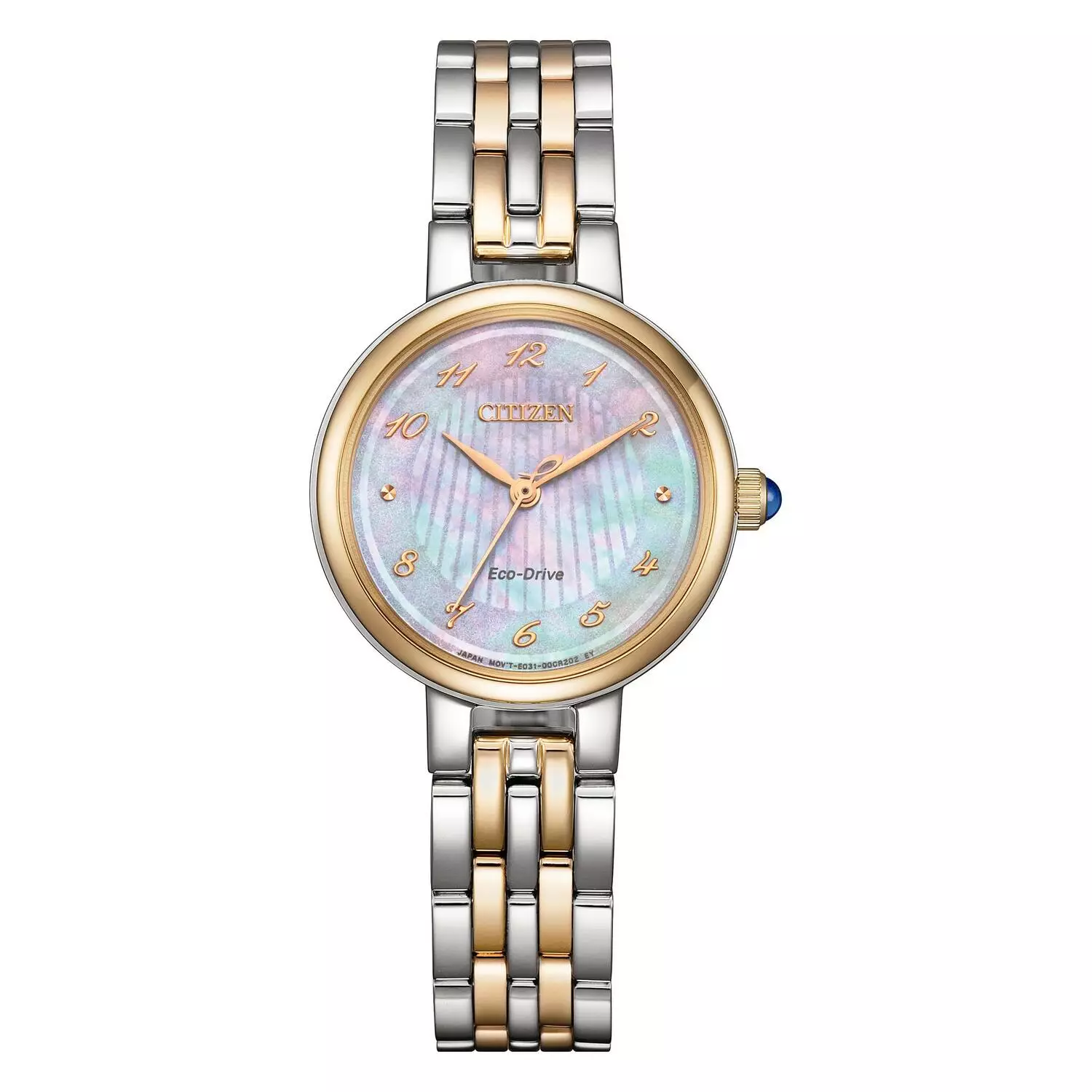 Citizen Eco-Drive - kaunis naisten rannekello jossa teräs/rose ranneke ja vaaleanpunainen helmiäistaulu.