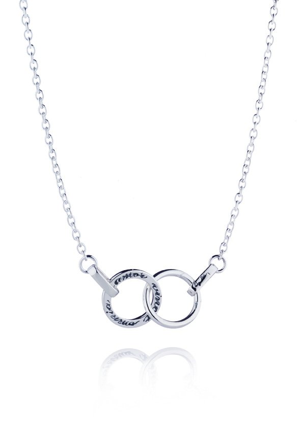 Kaksi rengasta on kietoutunut yhteen, toisessa renkaassa teksti : Amor Vincit Omnia -Rakkaus voittaa kaiken