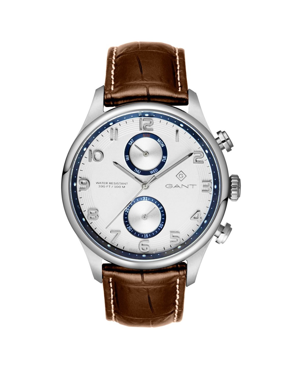 Gant Southampton - miesten rannekello ruskealla nahkarannekkeella, kellossa viikonpäivä ja päivämäärä näytöt.