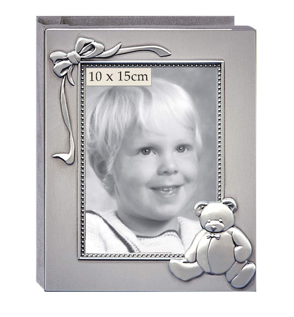 Tinattu valokuva albumi 10x15cm kokoisille kuville, kannessa koristeena nalle ja rusetti
