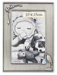 Tinattu kastekehys haikaran kuvalla, joko vaaleansininen tai -punainen. Kehyksen ylä- ja alareunassa tilaa kaiverruksille.