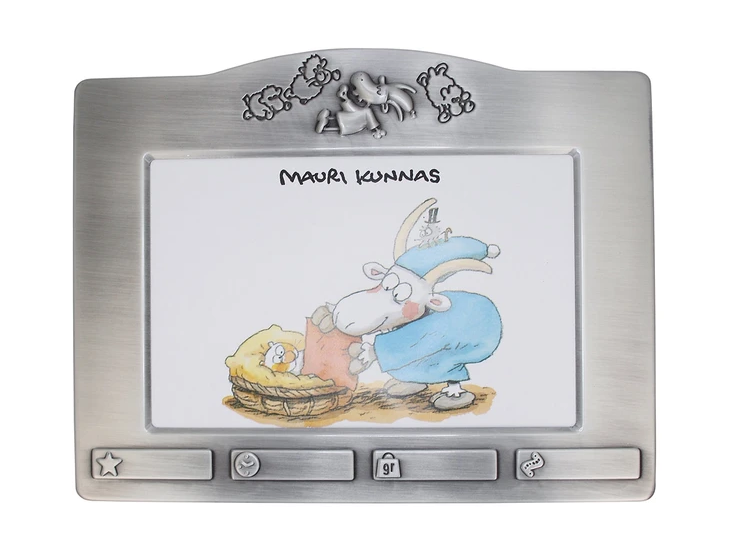 Tinattu valokuvakehys jossa Herra Hakkarainen, kehyksessä omat paikat kaiverrustiedoille.
