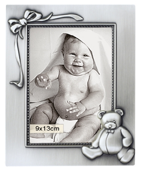 Tinattu kastekehys jossa nalle ja rusetti, kehyksen ylä- ja alareunassa tilaa kaiverruksille.