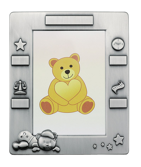 Tinattu kastekehys jossa suloinen nalle, kaiverruksille on omat nimetyt paikat kehyksen ympärillä.