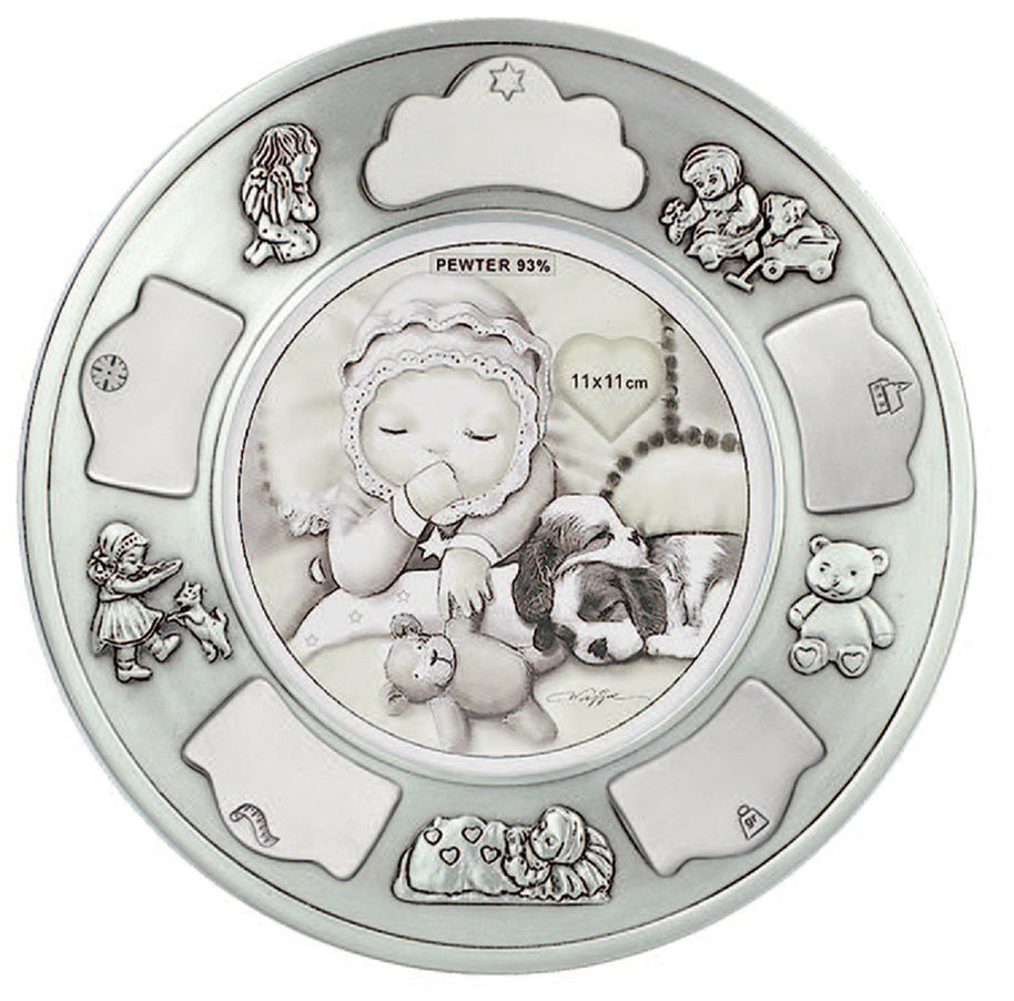 Kastekehys tinaa, kehyksen ympärillä kuvia sekä paikat kaiverruksille