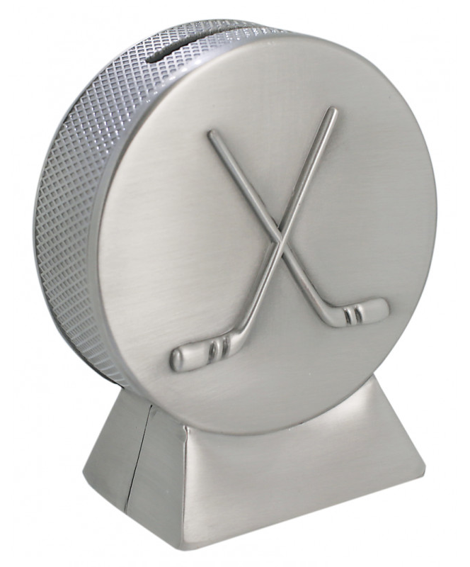 Tinattu jääkiekko pankki, pankin takapuolelle voidaan tehdä kaiverrus.