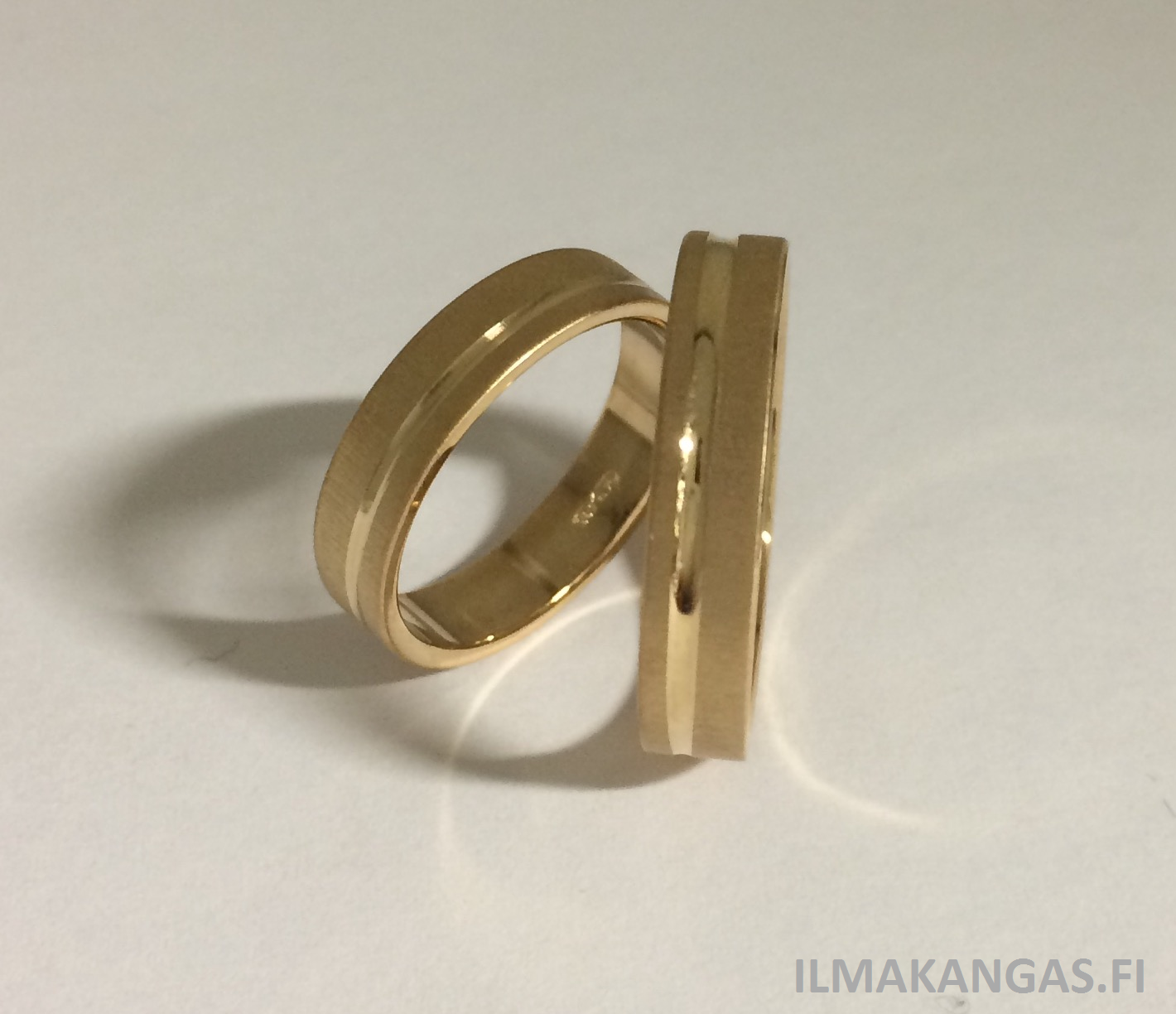 Keltakultainen 4mm leveä sormus flakka rungolla. Sormuksessa mattapinta ja ura. KAIVERRAMME TÄMÄN TUOTTEEN VELOITUKSETTA!
