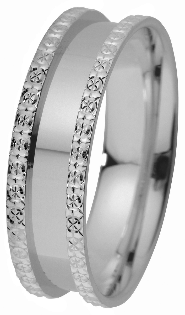 Näyttävä valkokultasormus jossa reunoilla säihkyy timanttihiotut pannat. Upea sormus muistosormukseksi tai vaikkapa kihla-ja vihkisormukseksi. Timanttihiottu pinta säihkyy kuin timantit, ilman timantteja!