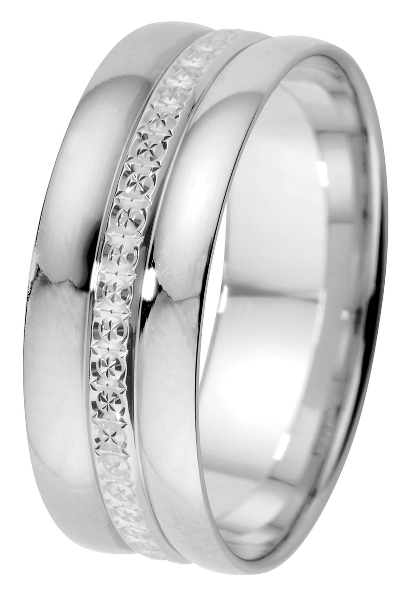 Näyttävä valkokultasormus jossa keskellä säihkyy timanttihionta. Upea sormus muistosormukseksi tai vaikkapa kihla-ja vihkisormukseksi. Timanttihiottu pinta säihkyy kuin timantit, ilman timantteja!