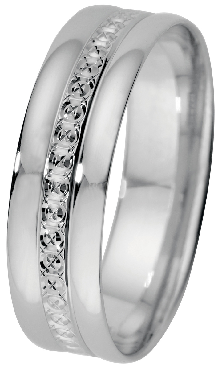 Näyttävä valkokultasormus jossa keskellä timanttihionta. Upea sormus muistosormukseksi tai vaikkapa kihla-ja vihkisormukseksi. Timanttihiottu pinta säihkyy kuin timantit, ilman timantteja!
