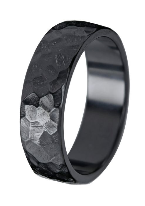 Kohinoor Black Duetto Rock upea 7mm leveä sormus mustaa zirkoniumia. Sormuksen pintaan taottu kalliota muistuttava kuviointi.