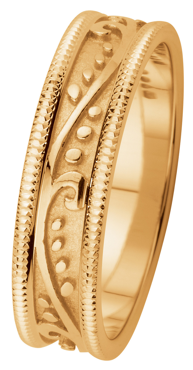 Kaunis, kuvioitu sormus fasettihiotulla reunalla. Käy muistosormukseksi tai vaikka kihla-ja vihkisormukseksi. Mielyttävä pitää pyöristetyn sisäpinnan ansioista.