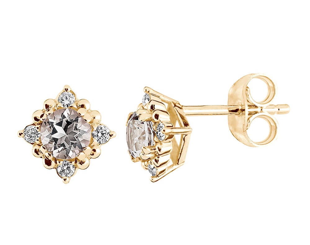 Kauniit keltakultaiset Kohinoorin Celeste korvakorut joissa 8x0,001ct timantit ja 4mm misty rose topaasit.