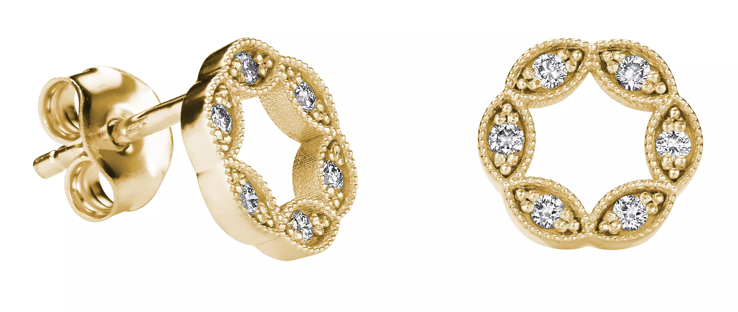 Kohinoor Clara keltakultaiset timanttikorvakorut joissa herkkä pitsimäinen muotoilu.
