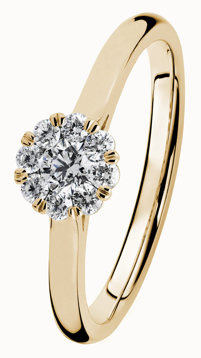 Kultakeskuksen Kohinoor Dahlia - upea keltakultainen timanttisormus. Sormuksen halo- koristeen keskellä 0,15ct timantti jota kehystää 8kpl 0,02ct timantteja.
