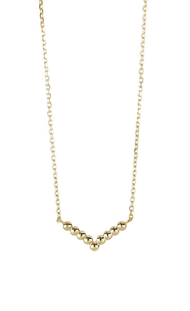 Siro V-mallinen koru saa muotonsa pienistä kultapalloista, ohut leikattu ankkuriketju lähtee kauniisti koru osan päistä.