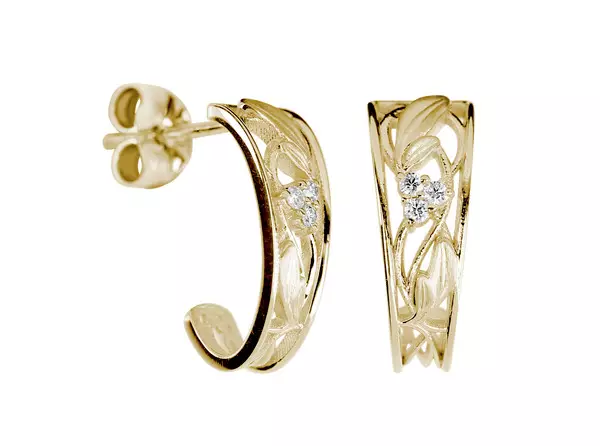 Kohinoor Ofelia - kauniit keltakultaiset korvakorut joissa lehtimäinen kuvionti ja pienet timantit.