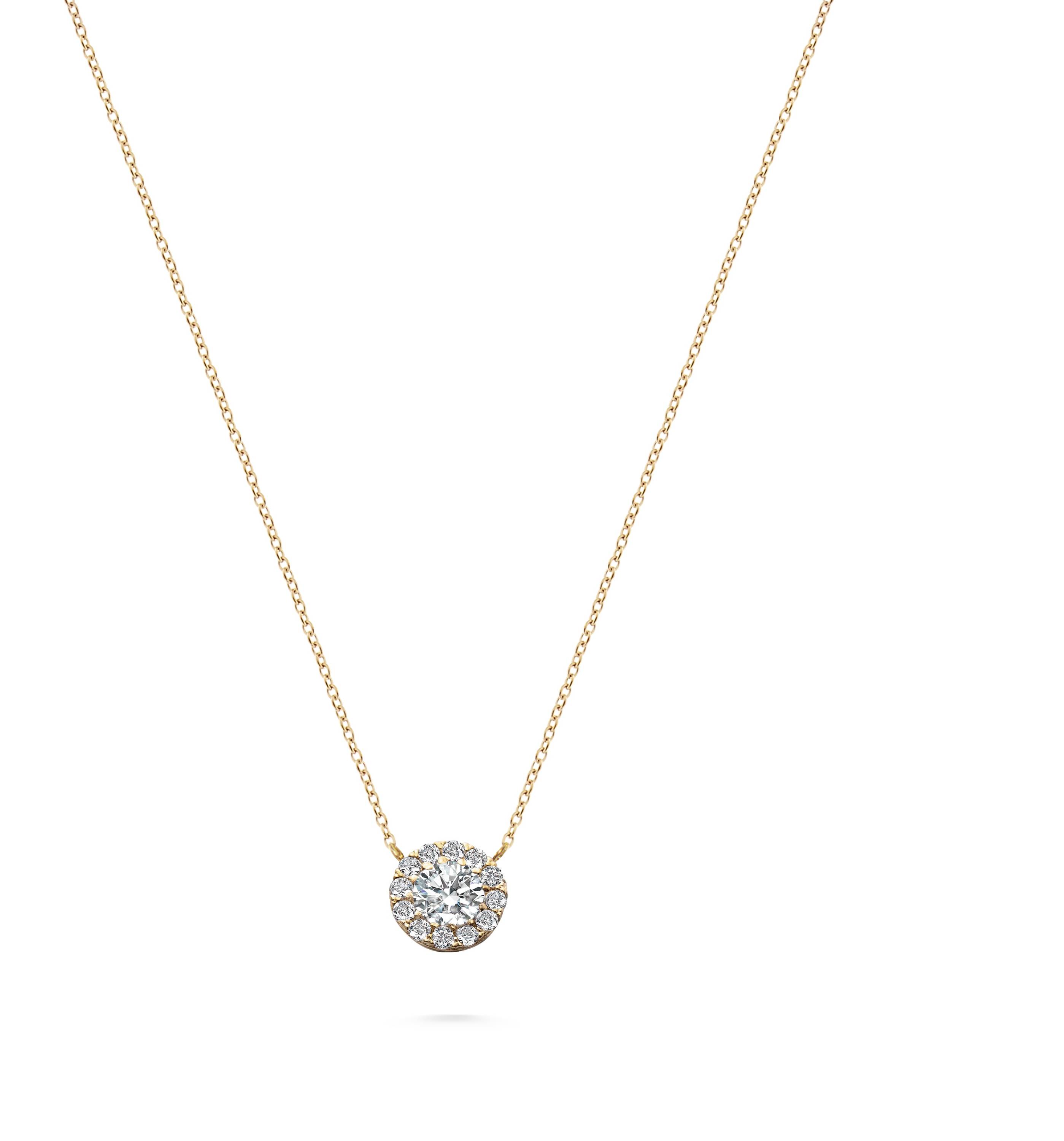 KAULAKORU, keltakultaisen ketjun keskellä on kiinteästi kiinnitettynä pieni zirkon koriste, jossa keskellä on isompi kivi ja reunoilla useampi pienempi.