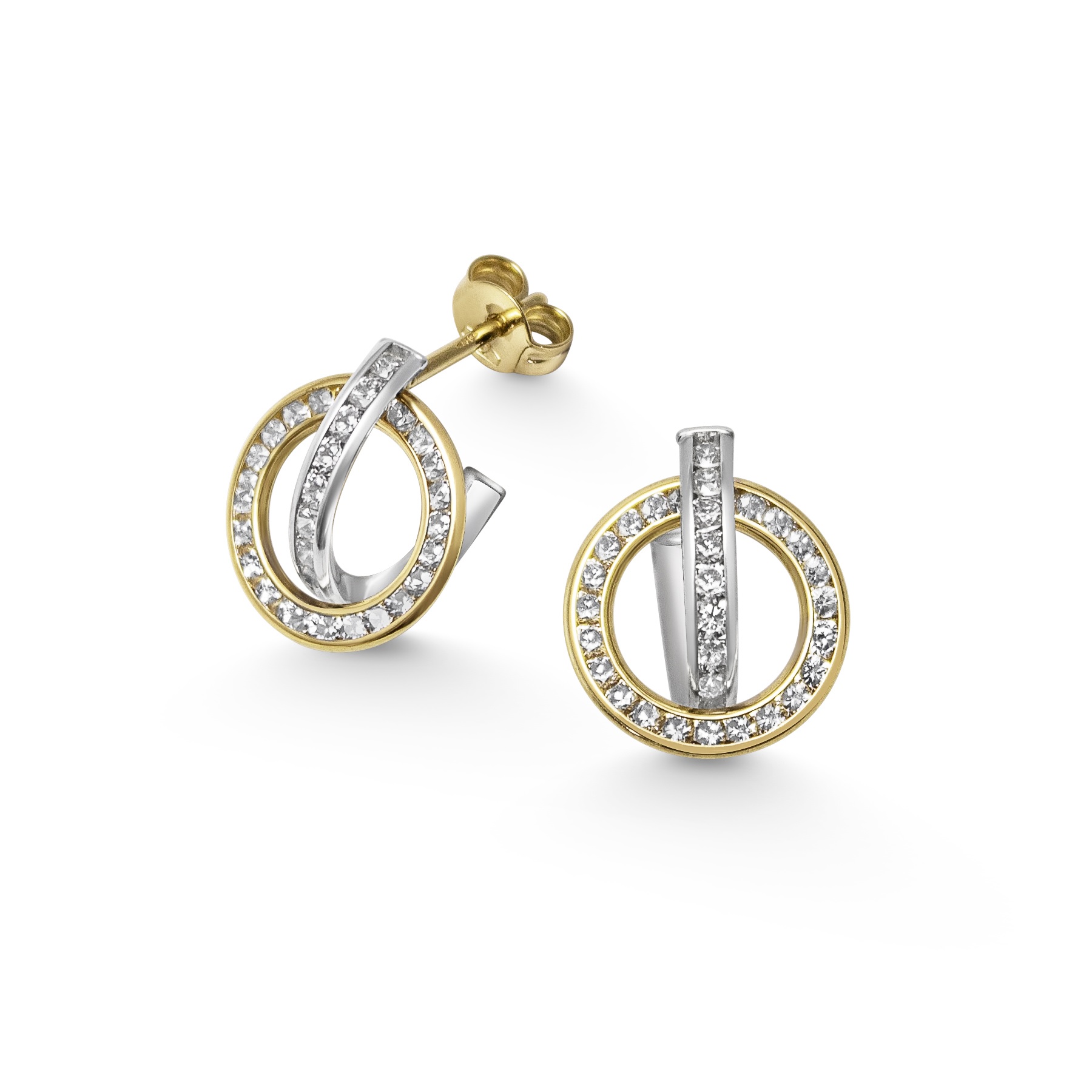 KORVAKORUT, keltakultaisen renkaan poikki kaartuu valkokultainen puolikaari. Näyttävät mutta kevyt korvakorut zirkon kivillä, hillityn tyylikkäät korvanapit.