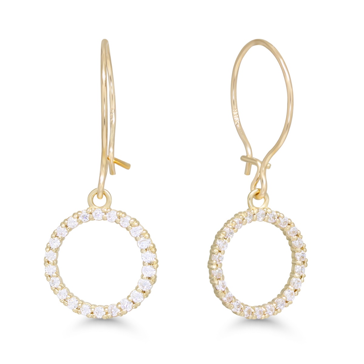Sievät kultaiset korvakorut koukku kiinnityksellä joissa zirkoneilla koristellut renkaat.