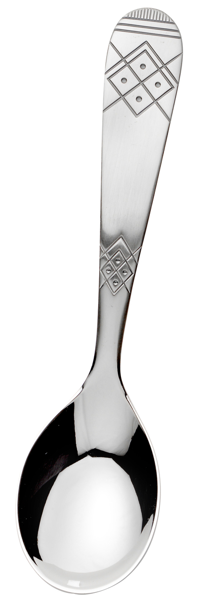 Aino pöytähopeasarjan lastenlusikka joka käy sekä kummilusikaksi että jälkiruokalusikaksi. Lusikan taakse voi kaivertaan nimen, päivämäärän ja halutessa myös kellonajan, painon ja pituuden.