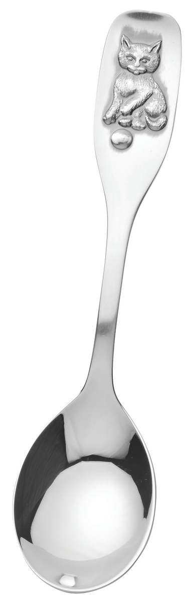 Hopeinen kummilusikka jonka etupuolella suloinen kissa leikkii lankakerällä, takana tilaa kaiverruksille.