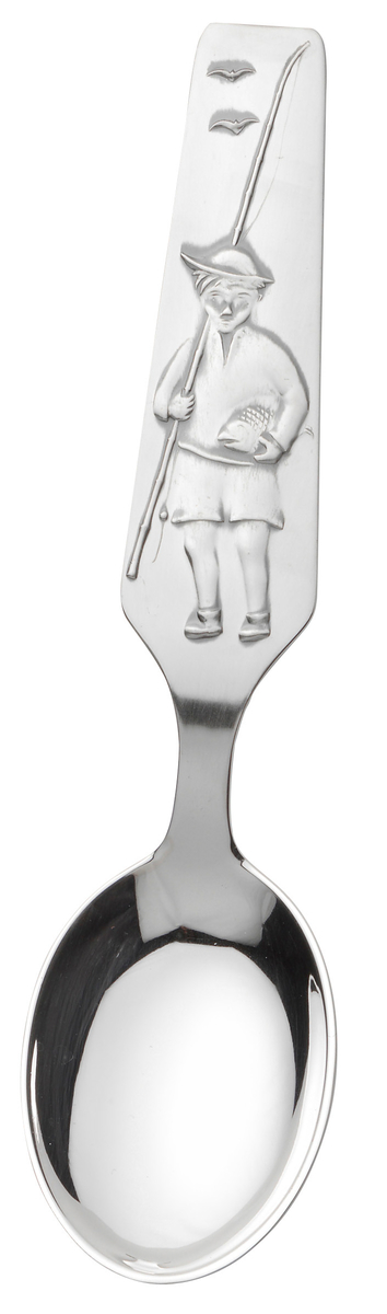 Hopeinen kummilusikka jonka etupuolella ihastuttava onkipoika kalasaaliinsa kanssa, takana tilaa kaiverruksille.