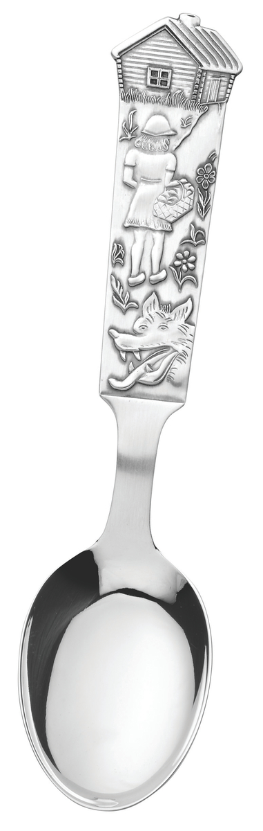 Hopeinen kummilusikka jossa klassikkosadusta tuttu punahilkka, lusikan takana tilaa kaiverruksille.