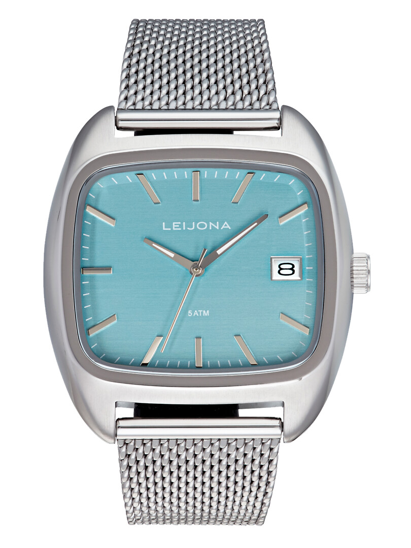 Leijona Hoods Olari - upea retrohenkinen uutuus! Muhkea ja kantikas kellotaulu kirkkaan turkoosina on oikea katseen vangitsija, kellossa teräksinen mesh-ranneke.