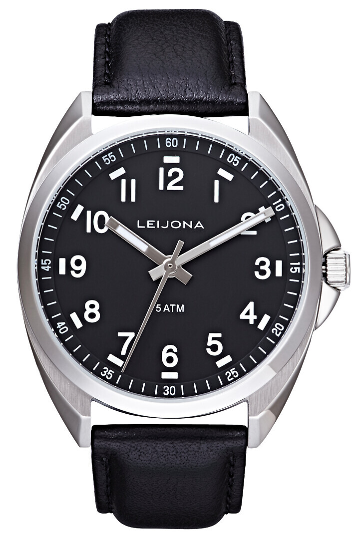 Leijona Kolovesi klassinen miesten rannekello mustalla kellotaululla ja mustalla nahkarannekkeella.