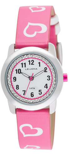 Leijona lasten rannekello pinkillä rannekkeella ja koristekivillä.