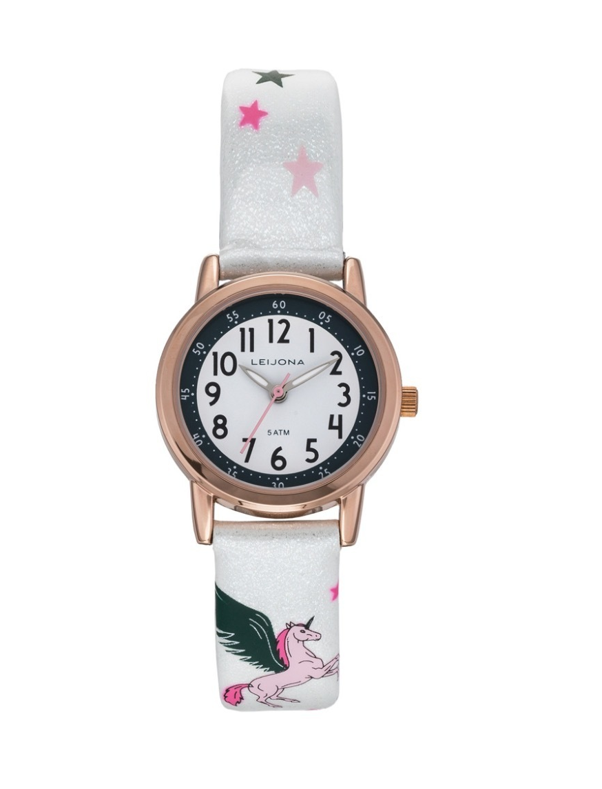 LEIJONA LASTEN RANNEKELLO 5323-883 Paristo koneisto Kellon kuori ruostumatonta terästä, ruusukullattu Valkea kimaltava polyuretaani ranneke jossa tähti ja yksisarvis kuvioita, 14mm leveä... Lue lisää
