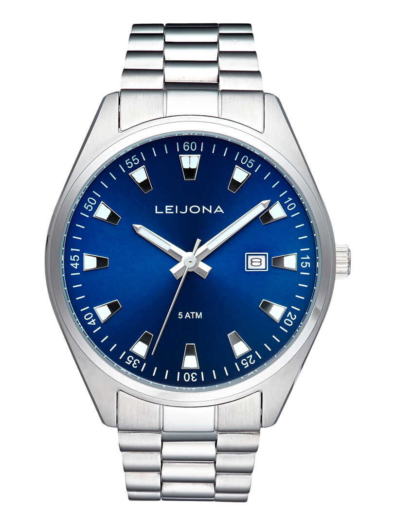 Leijona Luoto miesten teräksinen rannekello sinisellä kellotaululla.