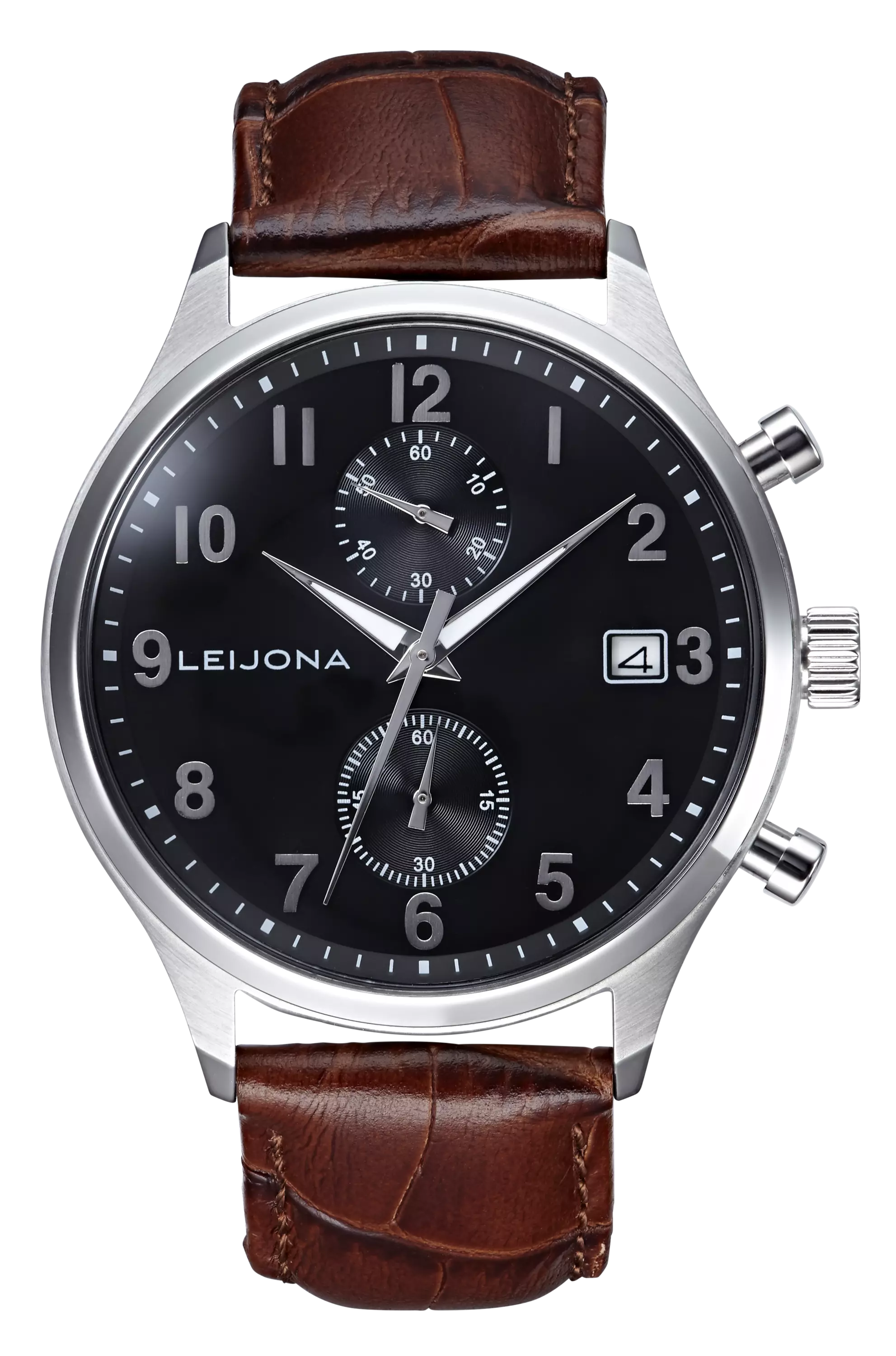 Leijona Ohra - tyylikäs mustatauluinen miesten kello kronografitoiminnoilla ja ruskealla nahkarannekkeella.