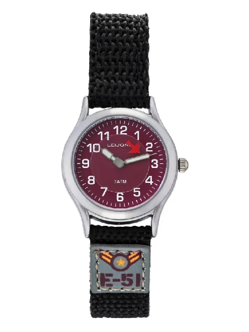Leijona Pilot lasten rannekello tekstiiliranteella, sekunttiviisarina toimii pieni lentokone.