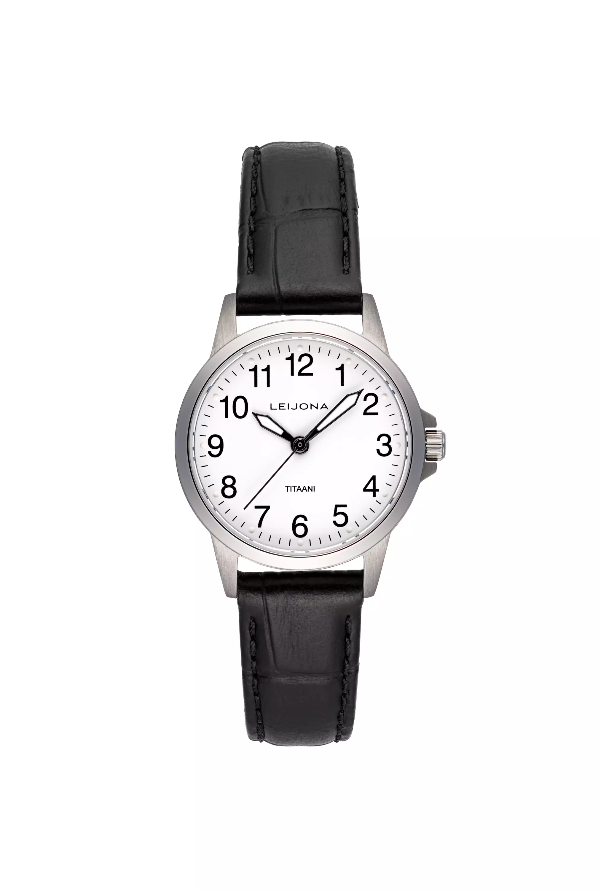 Leijona Ruokolahti - klassinen naisten titaanikuorinen rannekello mustalla nahkarannekkeella.