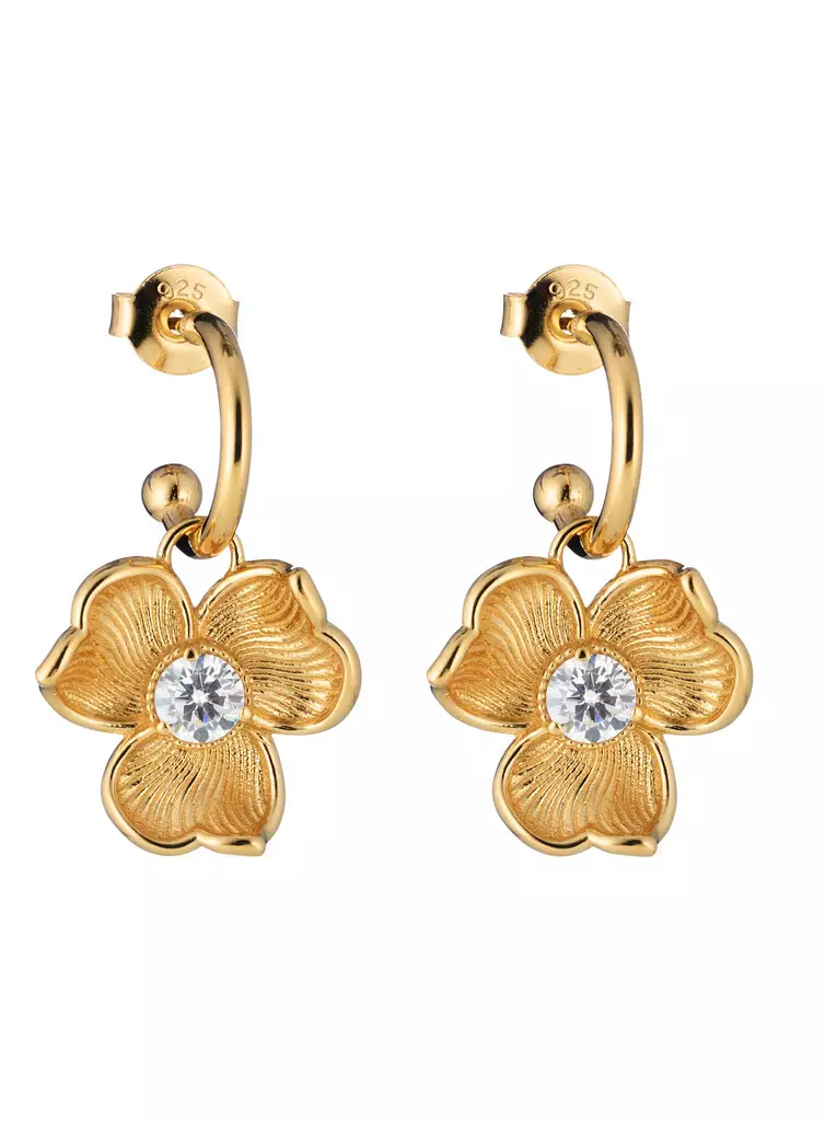 Lumoava Anna-sarjan korvarenkaassa roikkuu kaunis kukka jonka keskellä loistaa kirkas zirkon kivi. Korvakorut ovat kullattua hopeaa ja renkaassa on tappi kiinnitys