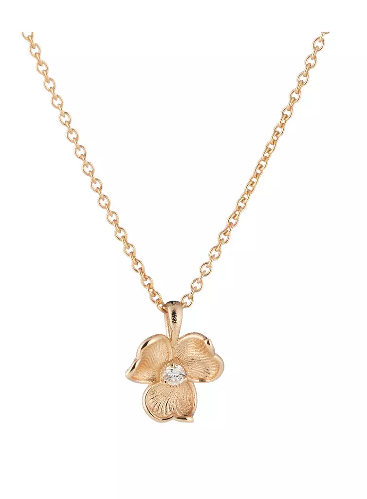 Lumoava Anna riipus on 14ka kultaa ja keskellä kukkaa säihkyy 0,03 w/vs laboratorio timantti. Koruun kuuluu 45cm pitkä kultainen ankkuriketju.