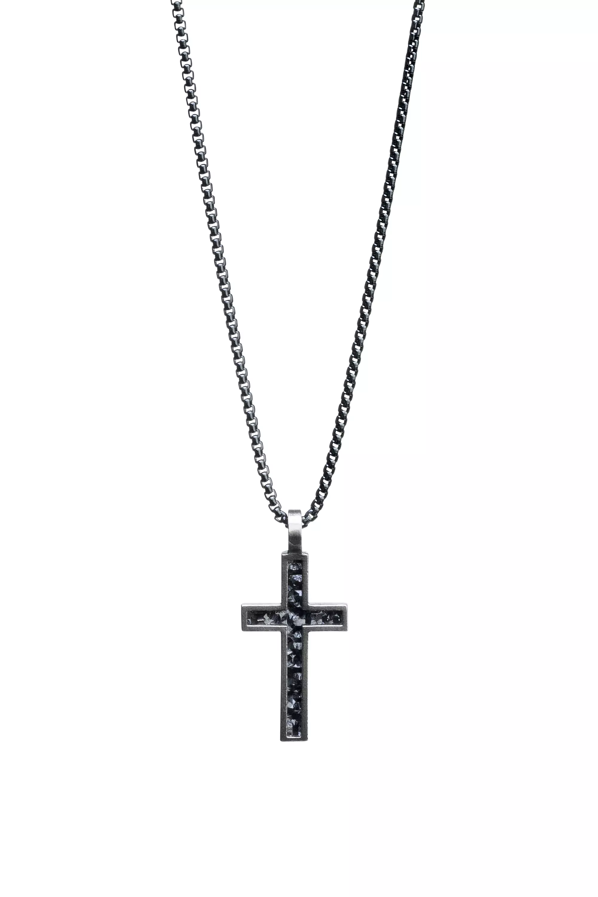 Lumoavan tummennettua hopeaa oleva Polku sarjan risti jossa selkeyttä rosoiselle pinnalle tuo tyylikkäät kehykset. Ristin taakse voidaan tehdä pieni kaiverrus.