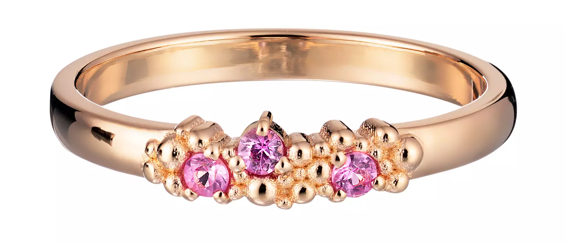 Upea täydennys Tiara mallistoon! Sormuksen siron koristeellinen istutus korostaa vaaleanpunaiset safiirien loistoa.
